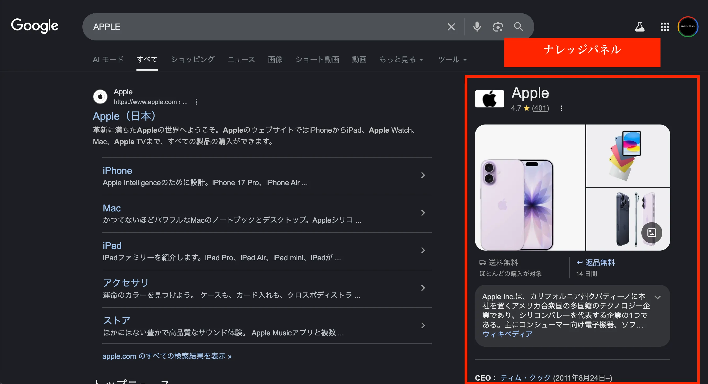 ナレッジパネルは、特定の企業、人物、場所、作品などを検索した際に、画面右側(モバイルでは上部)に表示される情報ボックスです。