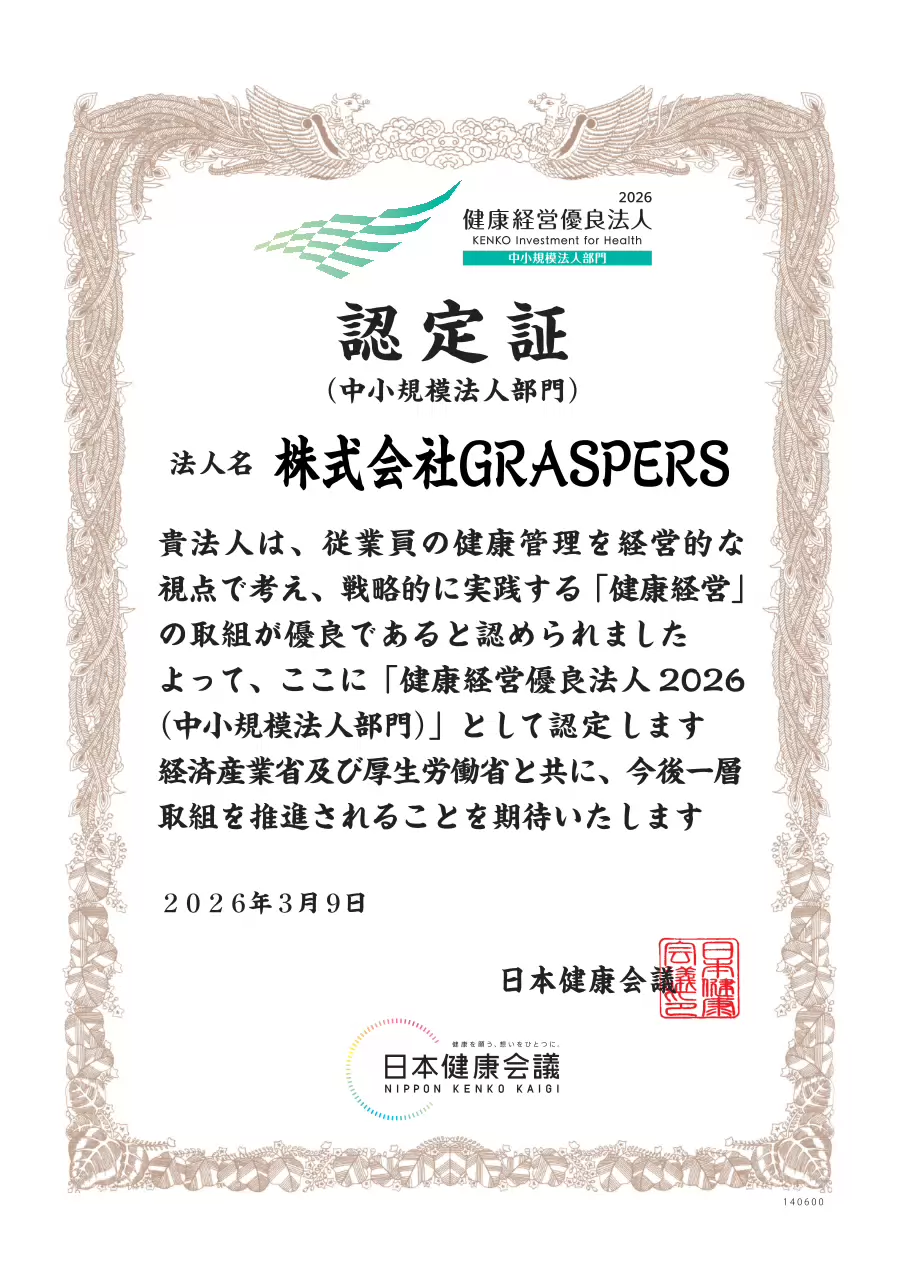 このたび当社株式会社グラスパーズは、経済産業省および日本健康会議が推進する認定制度「健康経営優良法人2026(中小規模法人部門)」に認定されました。