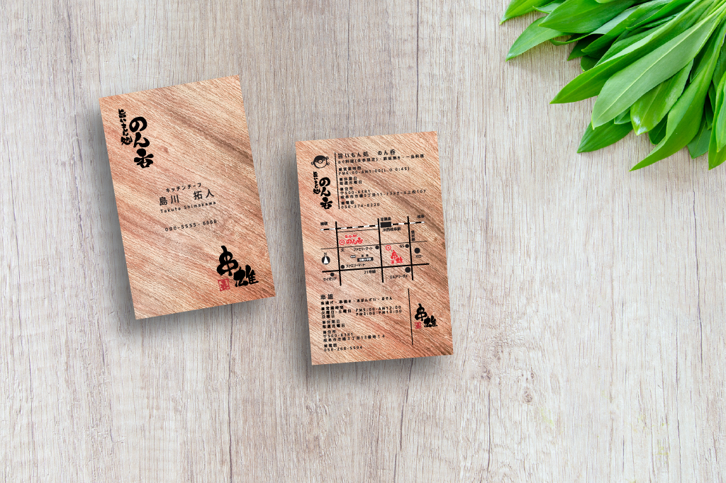 以前作らせていただいたオーナー様と同じデザインでスタッフ様の名刺を制作させていただきました。岐阜県岐阜市の「のん呑」様、「串雄」様名刺兼ショップカードをデザイン・製作させて頂きました。 実際に木の素材を使用すると、熱や水に弱いため、今回はウッドの模様をマットコートにプリントし、汎用性のある名刺に仕上げました。 かわいいイラストと相性の良いデザインを意識し、制作しています。