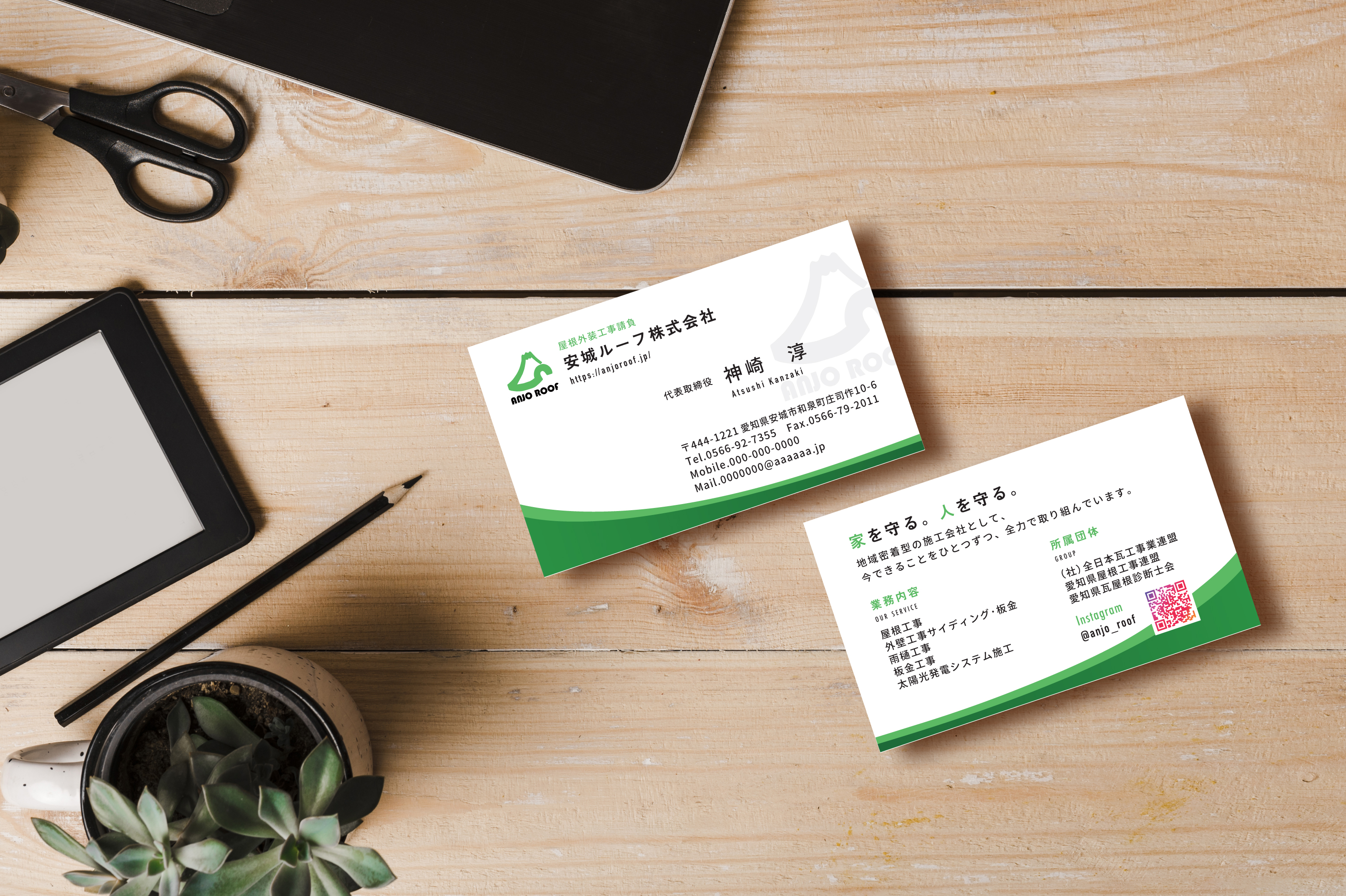 建築業は専門性が強い反面、初対面では伝わりにくいこともあるため、裏面には業務内容を分かりやすく整理して記載しています。城ルーフ様が長く使える名刺、そして信頼感を伝える名刺に仕上がっています。