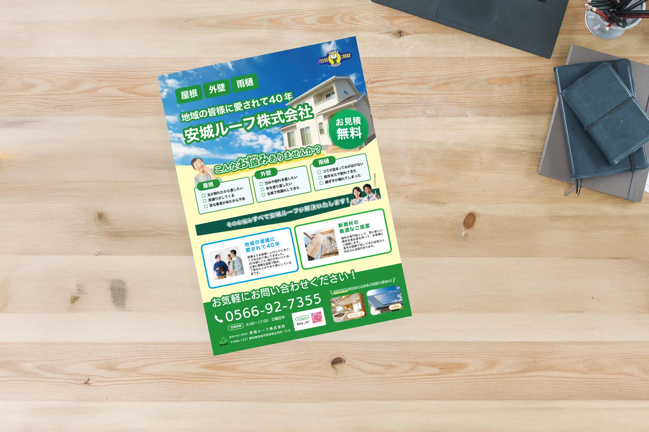 | 提案内容と制作ポイント | 屋根工事のチラシは暗くなりがちなので、明るい青空で“安心して任せられる雰囲気”を出しました。 問い合わせ導線を最下部に大きく配置し、チラシで最も大切な行動につなげる部分をしっかり目に入るようにレイアウトし、問い合わせしやすいチラシをご提案させていただきました。 |