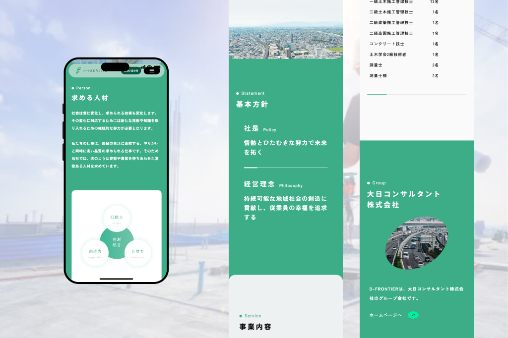キャッチコピー、代表挨拶、基本方針と未来顧客、既存顧客、求職者全ての方へ想いが伝わるような構成を目指しました。常に「第一線で、挑み続け、次の世代へ繋げ続ける」という根幹を随所に露出し、印象に残るホームページをご提案いたしました。