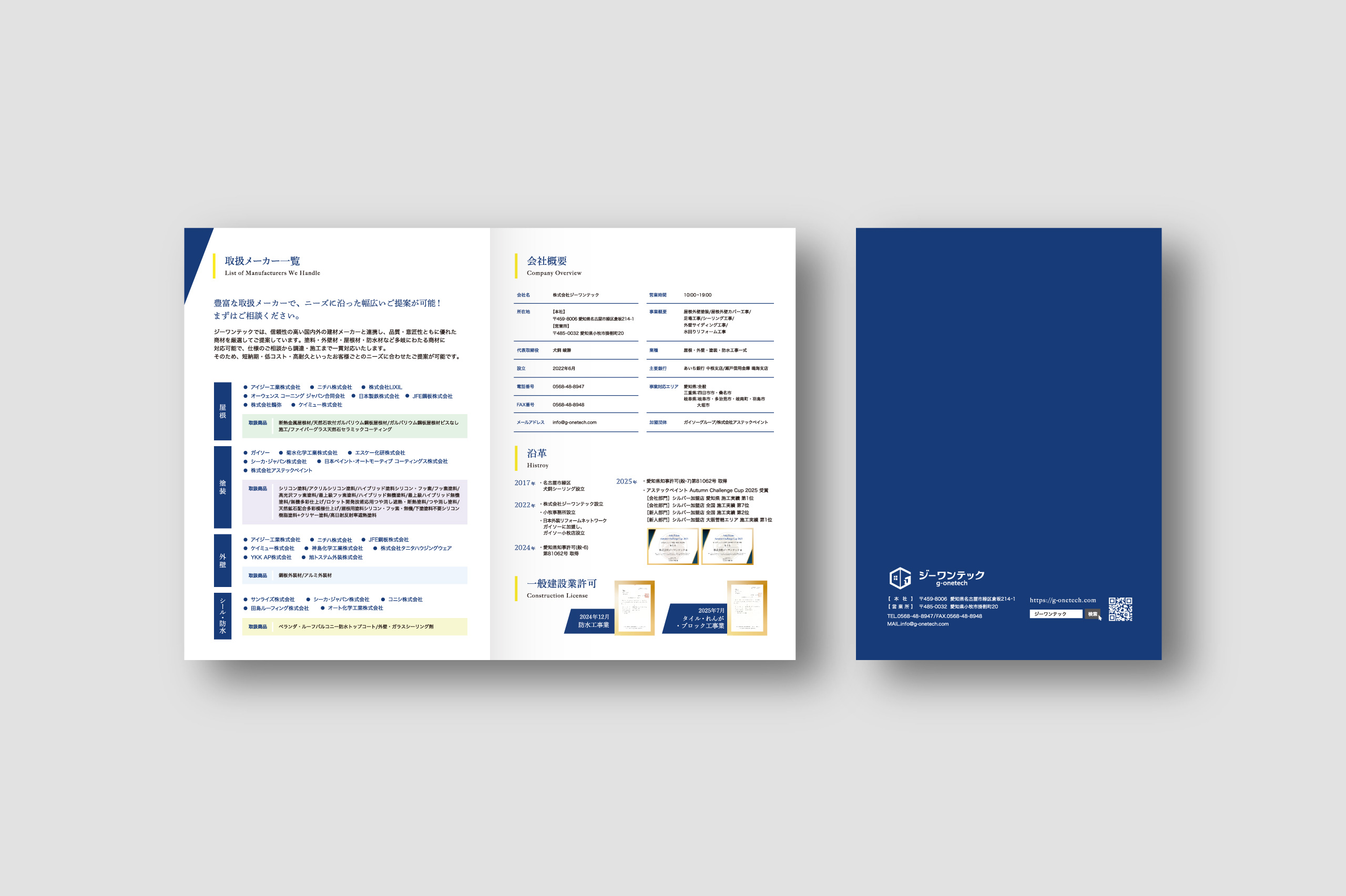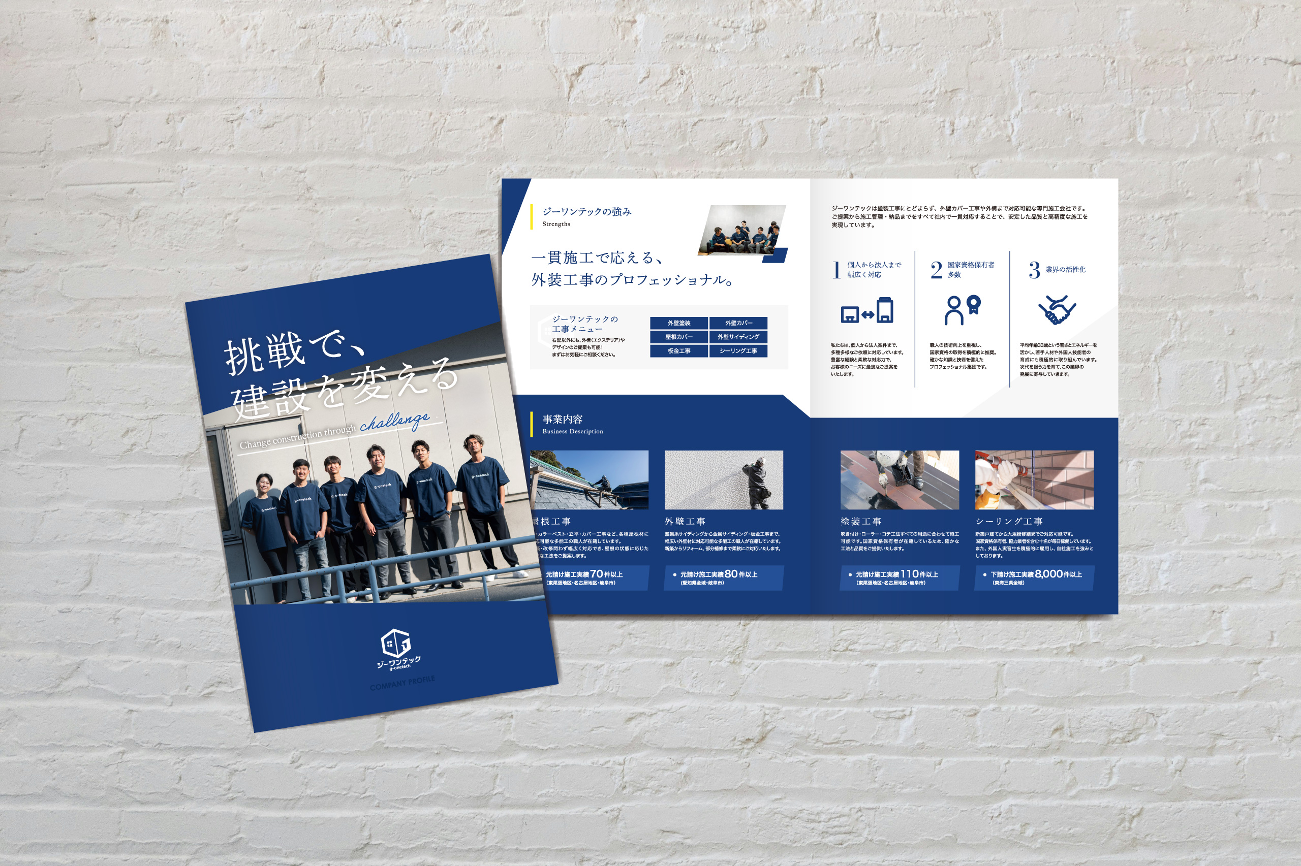 | 課題・ご要望 | 企業の強みや想いがしっかり伝わるパンフレットにしたい。加えて、施工内容や信頼性を分かりやすく整理し、営業ツールとして活用できる資料にしたいというご要望をいただきました。 |