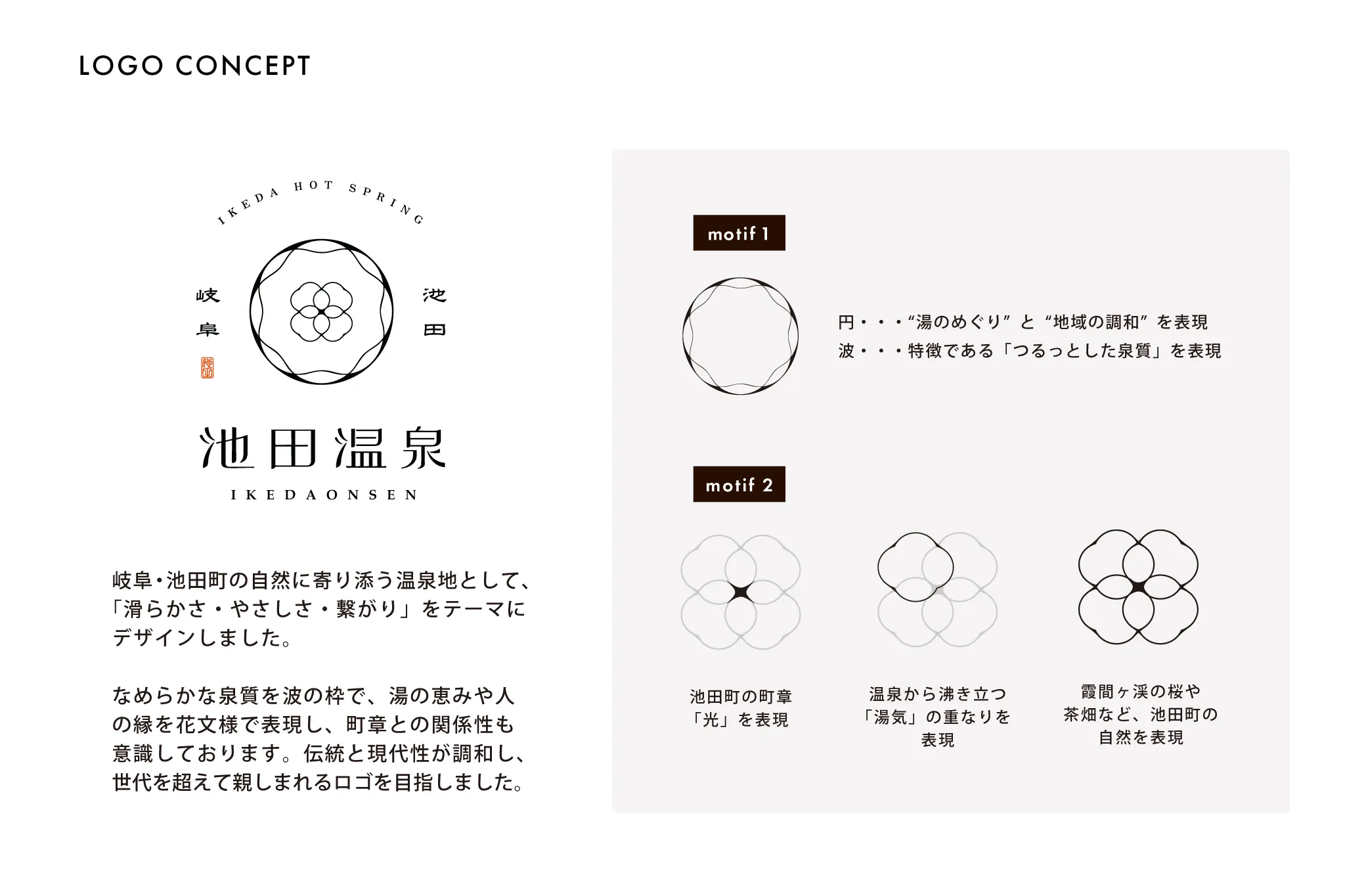 | 提案内容と制作ポイント | 「滑らかさ・やさしさ・繋がり」をテーマに、なめらかな泉質を波の枠で表現。中央の文様には湯の恵みと人の縁を込め、町章との関係性も意識しました。判子のような佇まいと細い線で、伝統と現代性が調和するロゴに仕上げています。 |