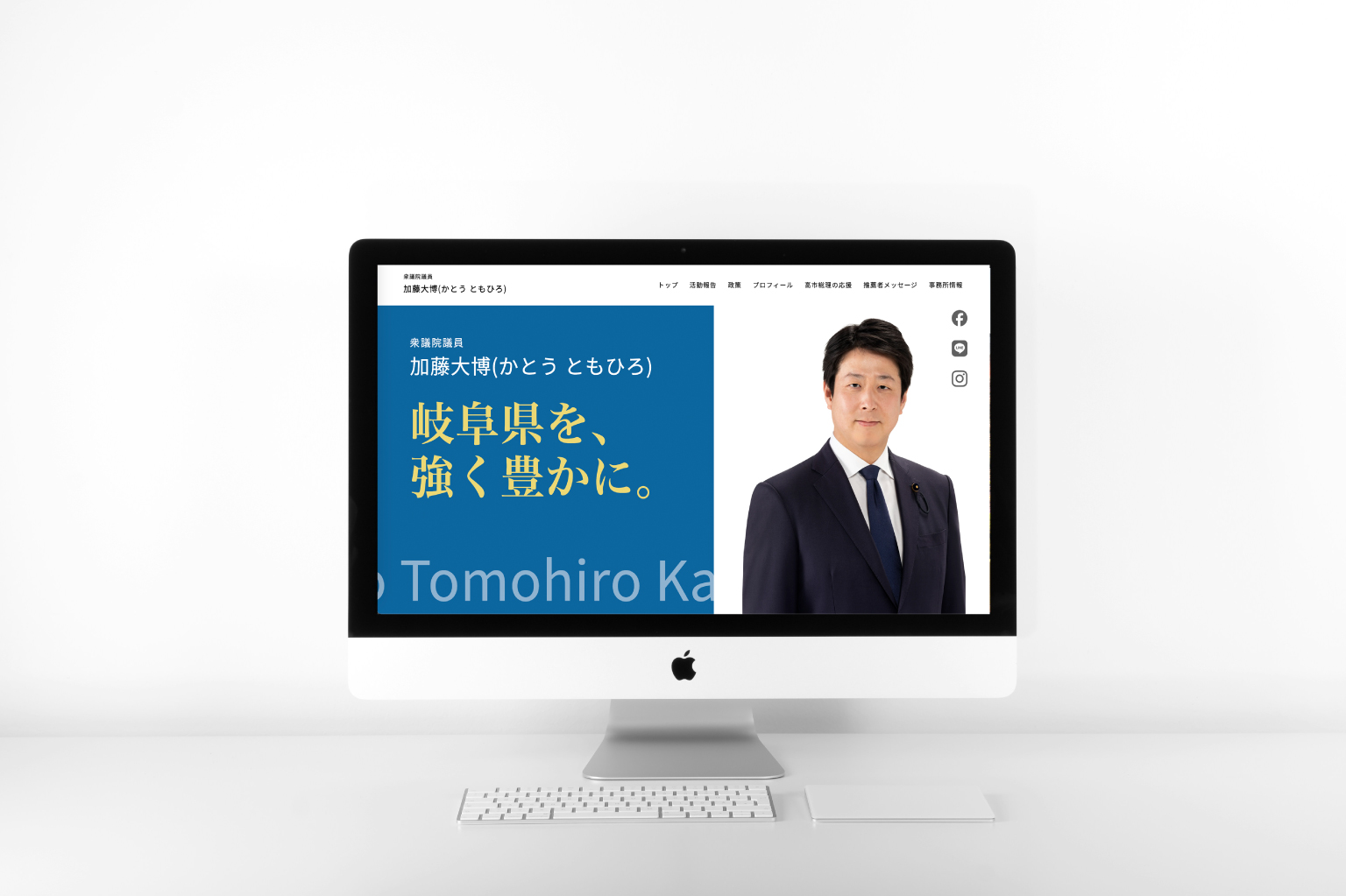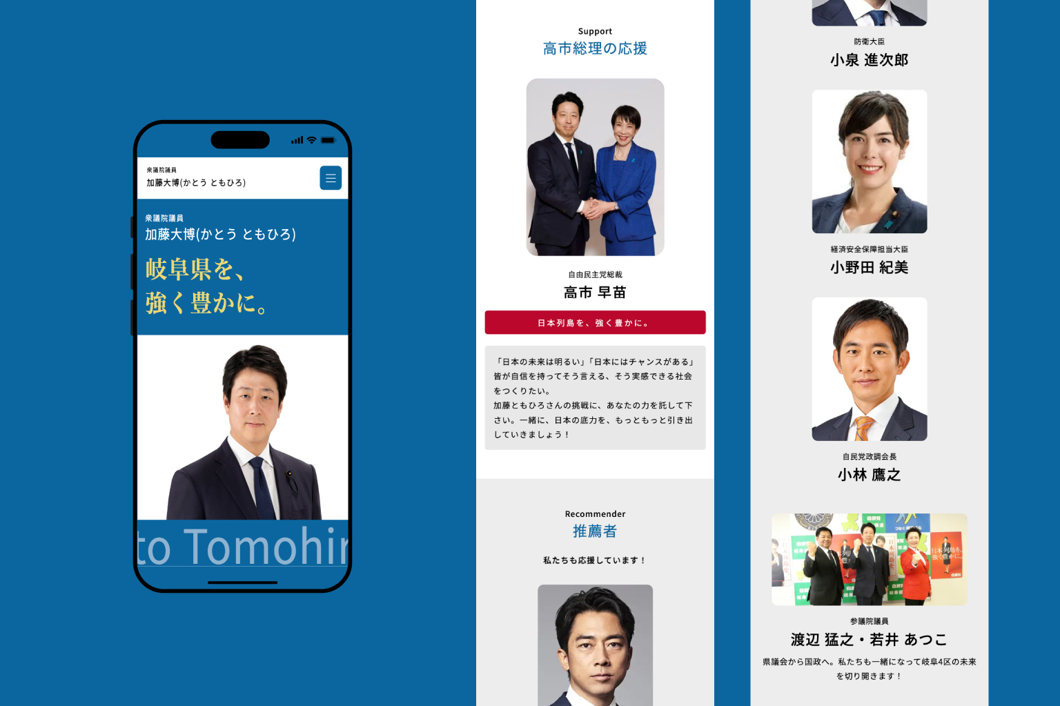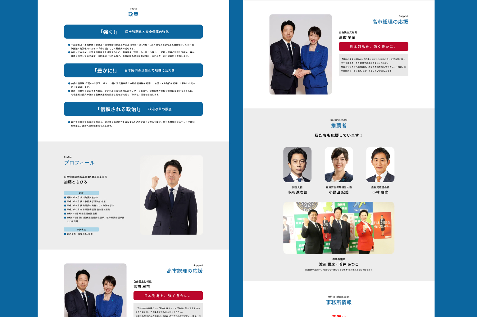 | 提案内容と制作ポイント | 第51回衆議院議員総選挙、岐阜県第四選挙区への出馬に際して多くの方が閲覧することを想定し、加藤様の政策、そしてプロフィールや情報が見た人に分かりやすいようにシンプルな設計を目指しました。 |