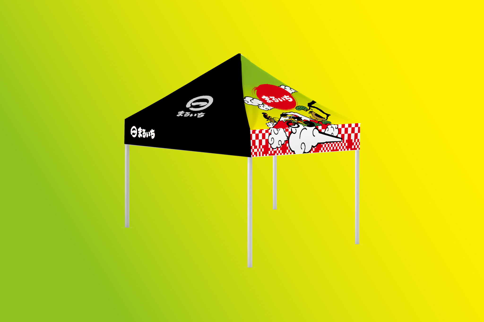 | 課題・ご要望 | 有限会社まるいち様より、展示会イベントに使用するブース用テントをご依頼いただきました。 屋外イベントになるため、まるいち様らしさを残しつつ、遠くからしっかり存在感を出し、ブランドイメージを強く残したいというご要望をいただきました。 |