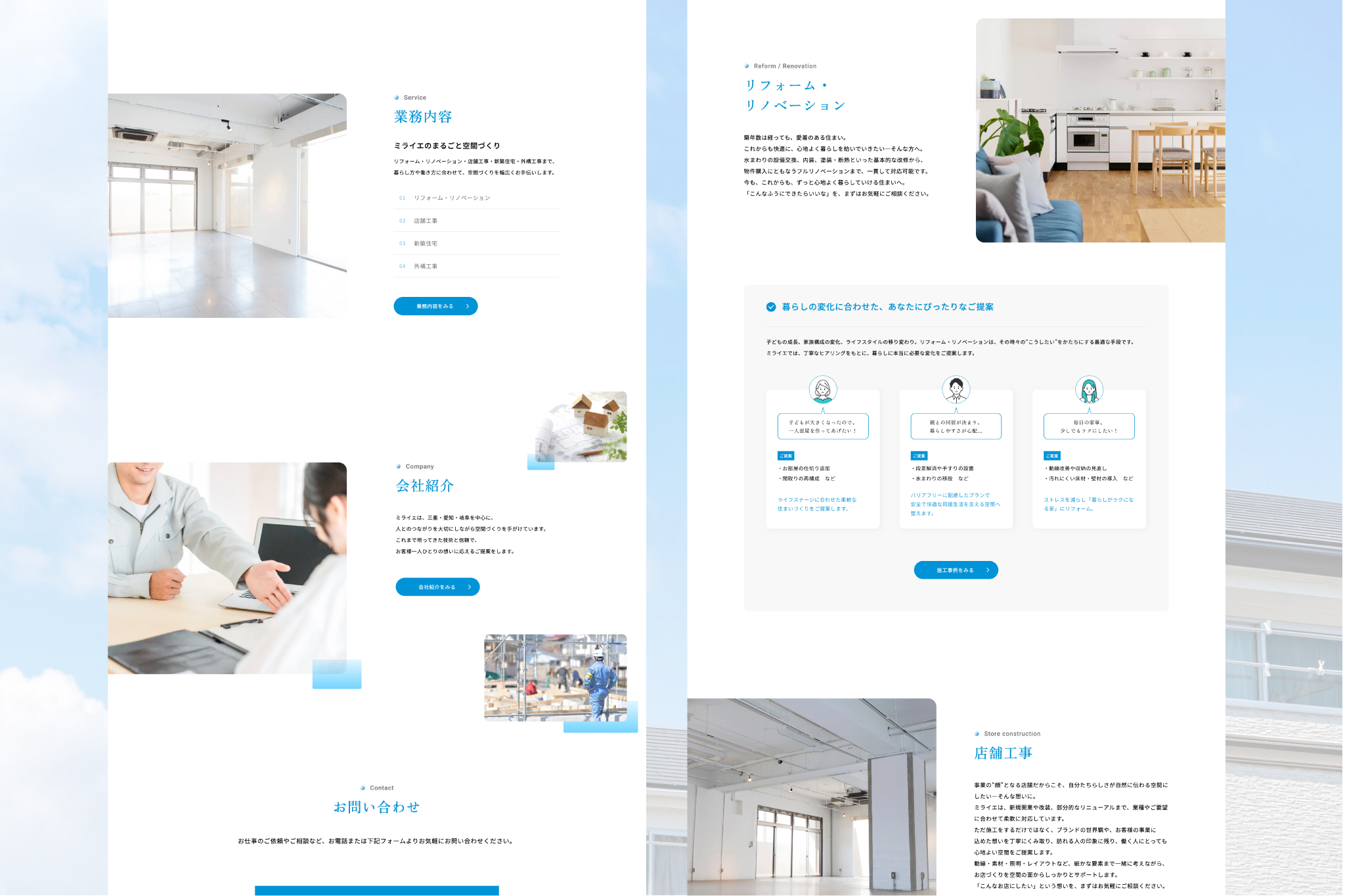 | 提案内容と制作ポイント | 建築・建設業としての信頼感を軸に、シンプルで見やすく、情報が整理されたデザインをご提案しました。施工実績や事業内容が直感的に伝わる導線設計とし、会社の強みや想いがしっかり伝わる構成にしています。全体として、堅実さと誠実さが感じられるトーンに仕上げました |