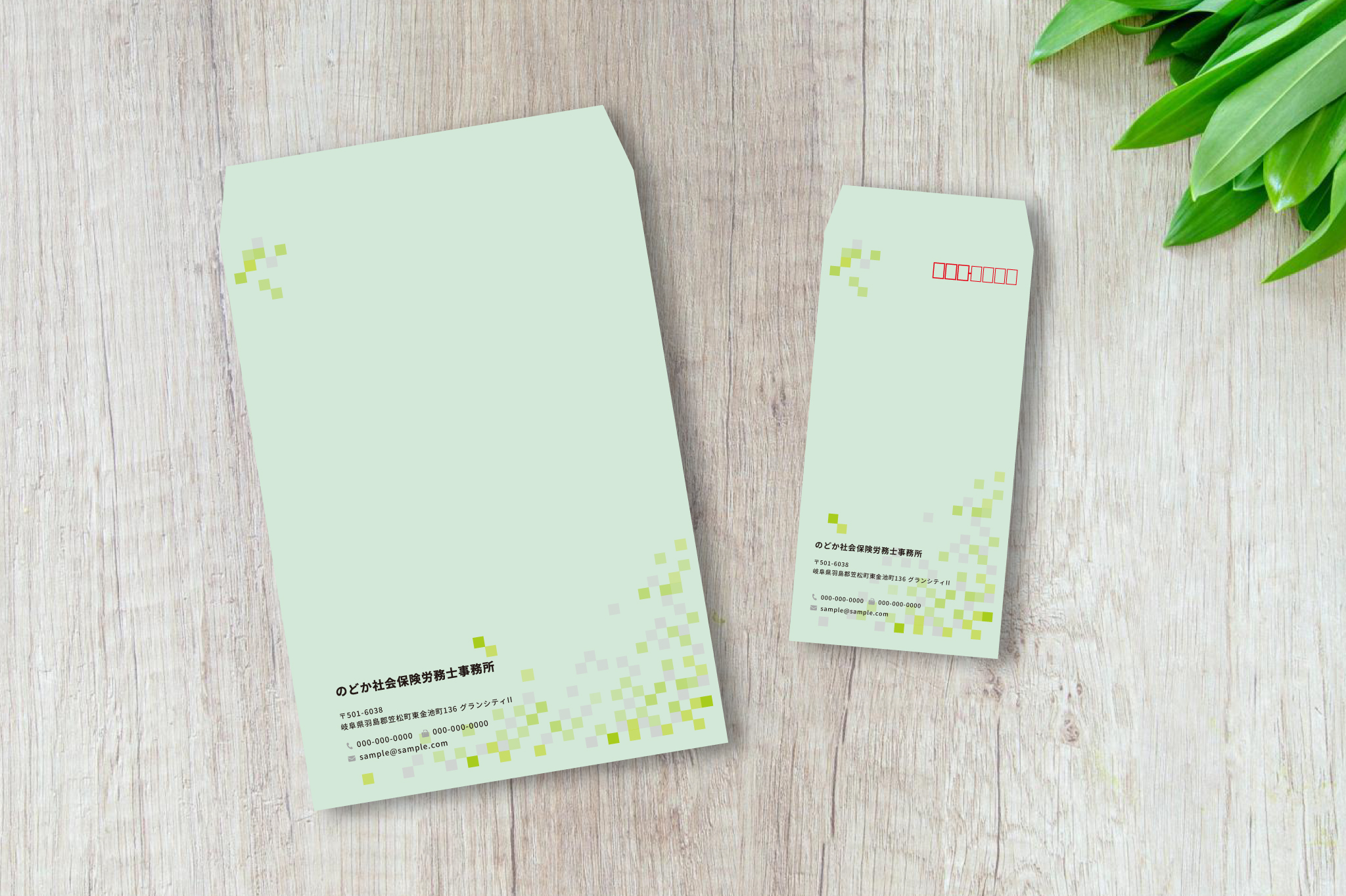 | 提案内容と制作ポイント | 名刺とデザインを統一し、やわらかさと誠実さが伝わる封筒デザインをご提案しました。淡いグリーンを基調に、ピクセル調のアクセントをあしらうことで、親しみやすさと信頼感を両立。事務所名や連絡先は視認性を重視し、ビジネスシーンでも使いやすいバランスに仕上げています。 |