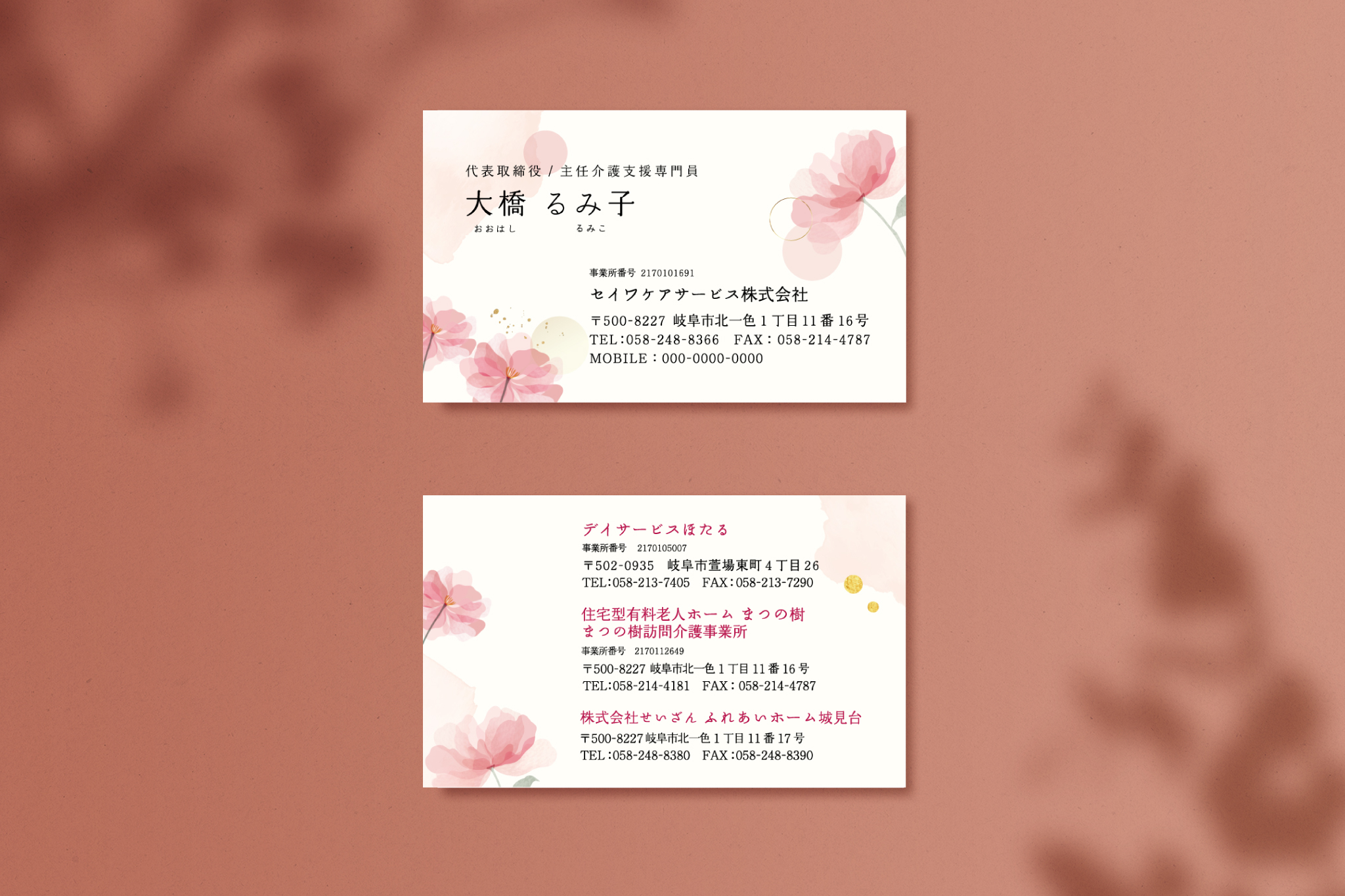 | 提案内容と制作ポイント | 柔らかさ、温かみの感じられる名刺をご提案いたしました。花のイラストを使用することで、女性らしく安心感のあるデザインです。 |